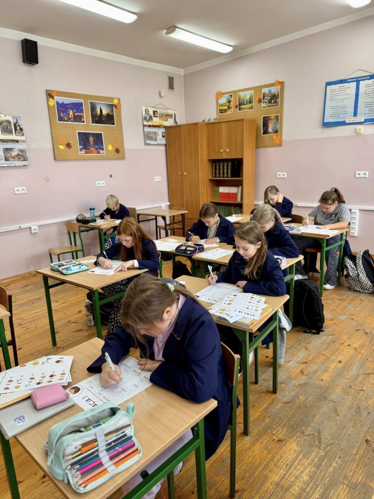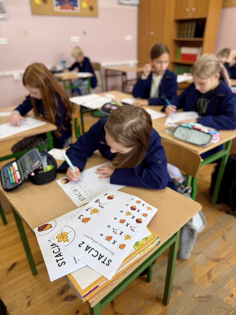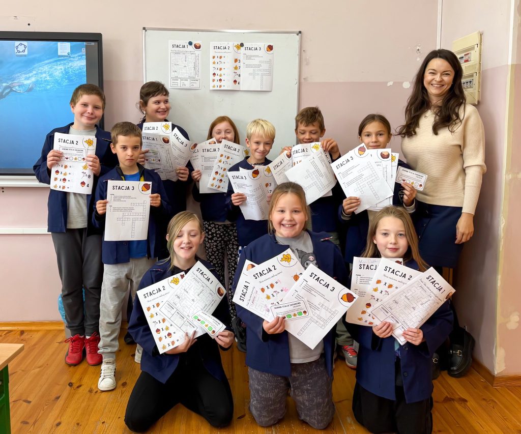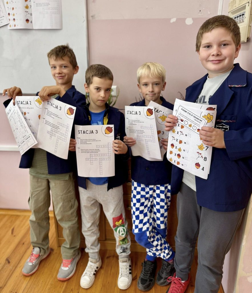 Uczniowie klasy 4b podczas zajęć z wychowawcą w kreatywny sposób rozwiązywali zadania z zakresu gramatyki, matematyki i wiedzy przyrodniczej, posiłkując się jesiennymi kartami pracy.